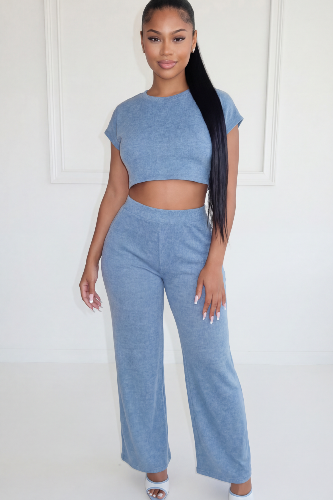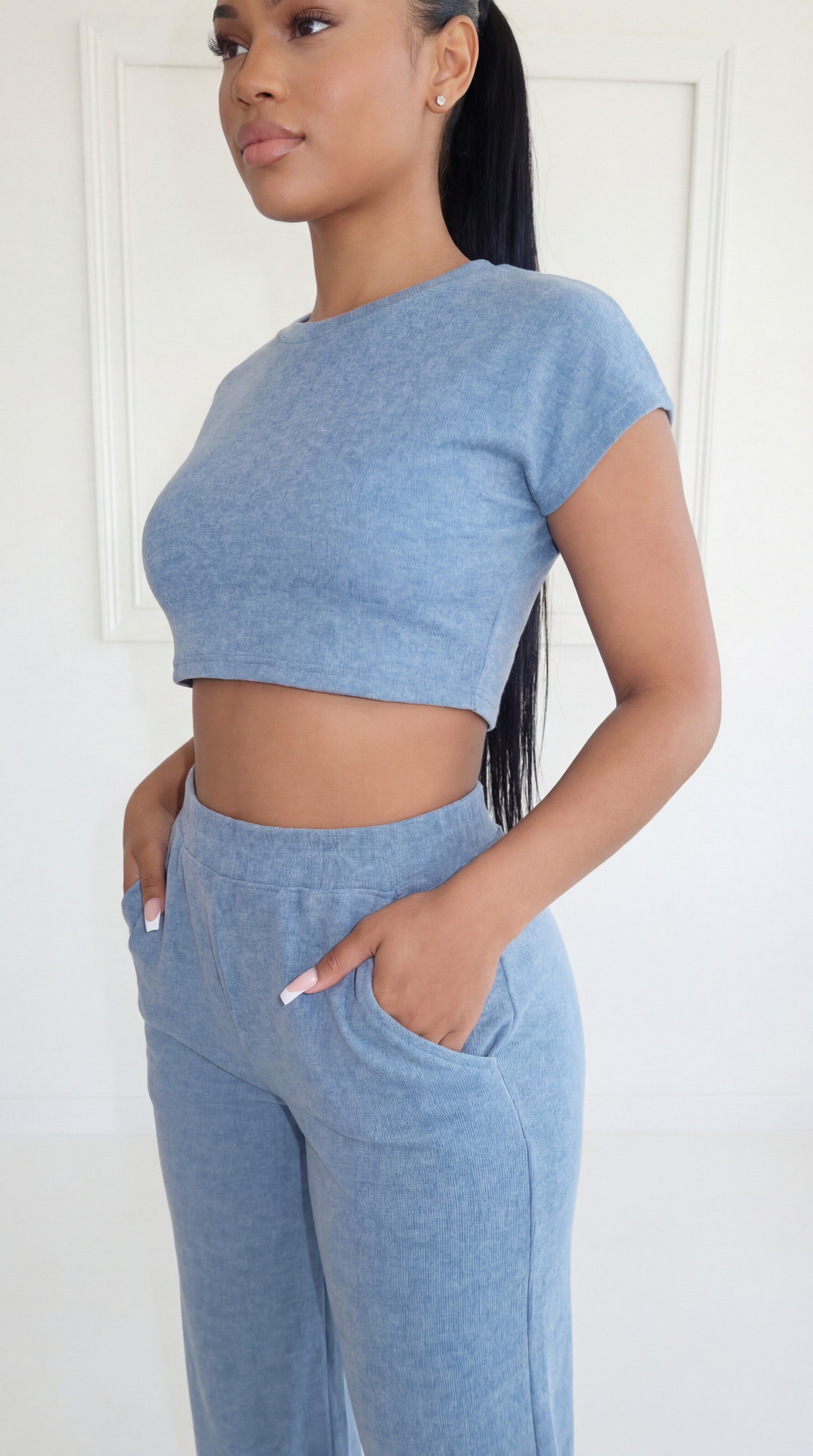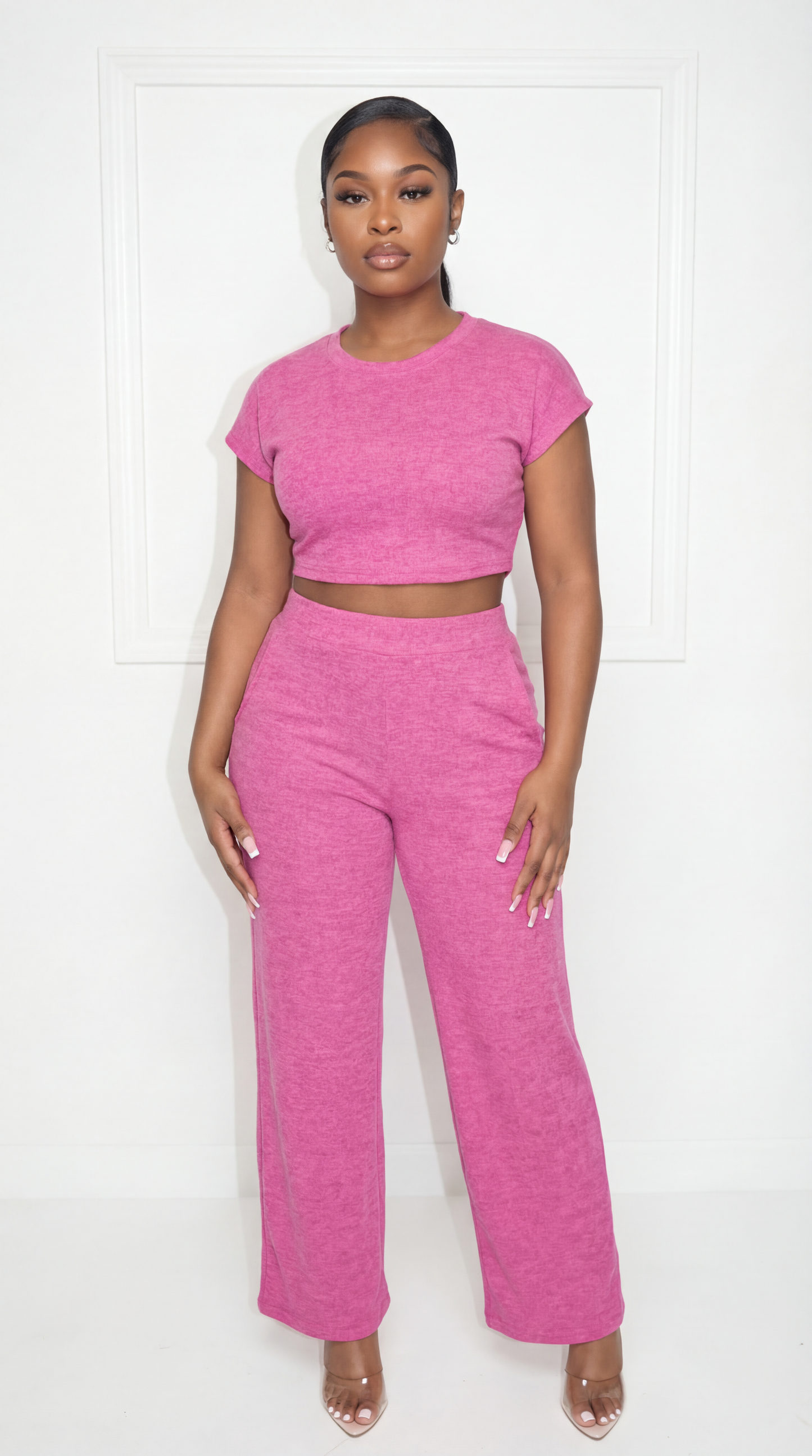 This 2 piece set is the one you need for any occasion! Features a crop top and and high-waisted wide leg pants with pockets. This set is perfect for running errands or going out on the town. Dress this up or down.
