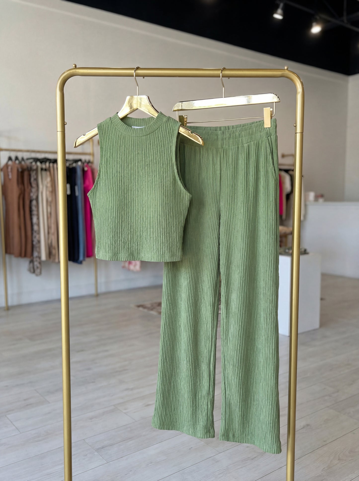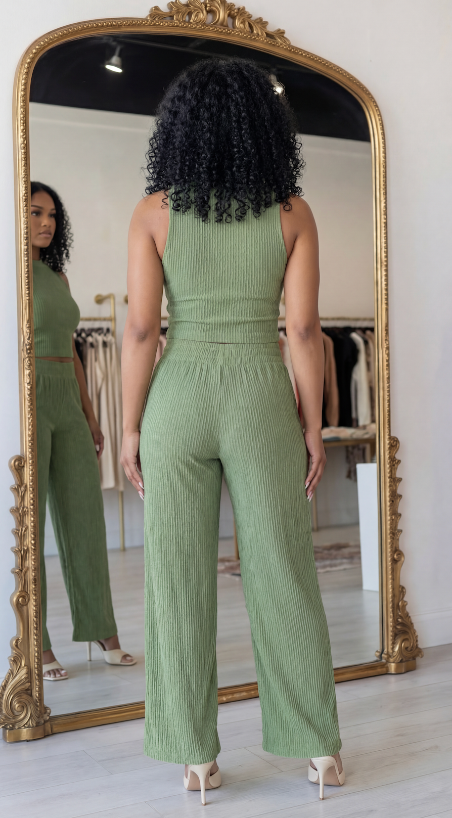 Introducing our sage green two-piece set—a chic crop top paired with high-waisted, wide-leg pants. Crafted from a soft, breathable knit, this ensemble offers both comfort and effortless style. The serene sage hue adds a touch of sophistication, making it perfect for spring outings.